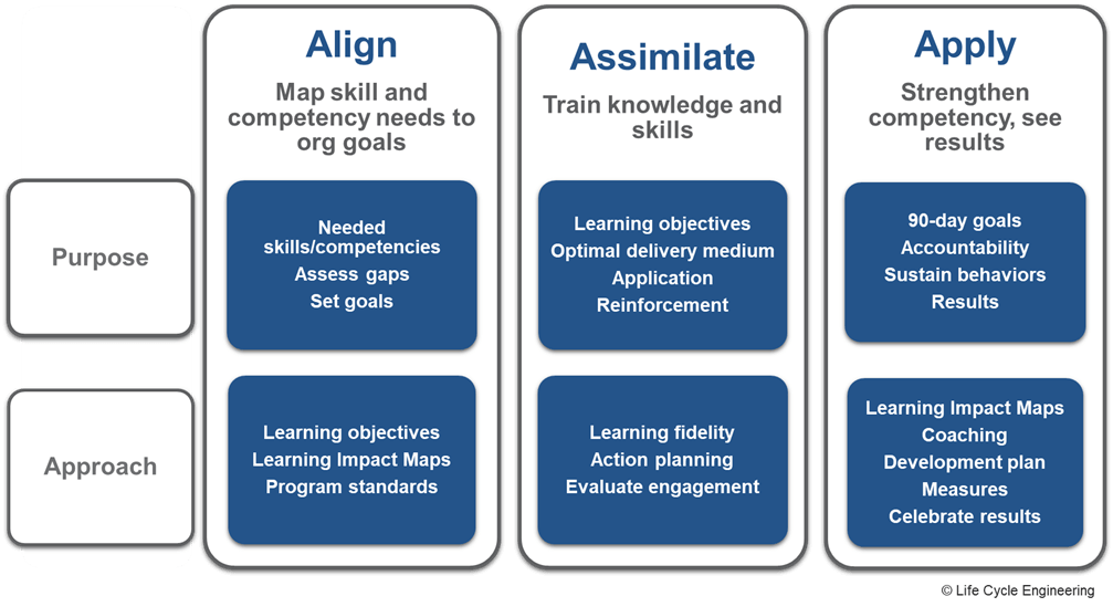Effective training occurs when it is fully applied and when desired results are achieved. When attending a class, retention and application of the new knowledge and skills will vary from 10 to 30% based on the type of class and content. Two factors heavily influence the extent to which the training is applied – retention and management support. When retention strategies and management support are included in the learning initiative, the application of new knowledge and skills will be much higher, often 90% or better. At the Life Cycle Institute, we call this High Impact Learning and the 3A Learning process enables these results by encouraging leadership involvement and applying retention strategies that ensure learning is not only an event, but is a true process that changes behavior and performance.